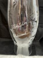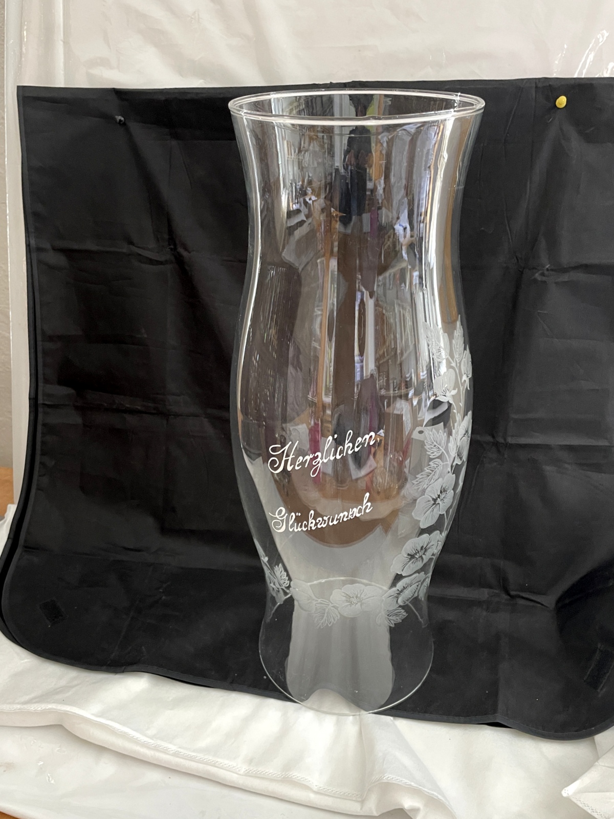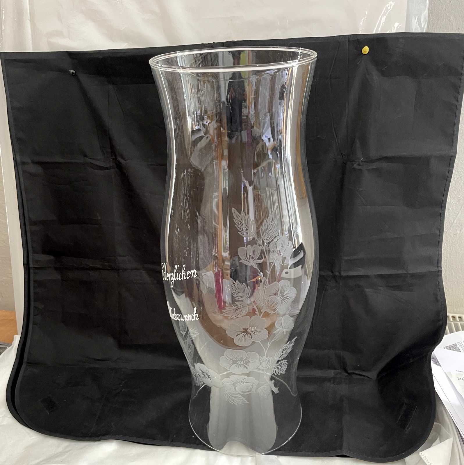 Windlicht großer Glaszylinder mit Schriftzug „Herzlichen Glückwusch“ und eingravierten Blumen ohne Boden klar Öffnung unten und oben ca. 17 cm, Höhe ca. 50 cm Durchmesser Breiteste Stelle 19 cm mundgeblasen