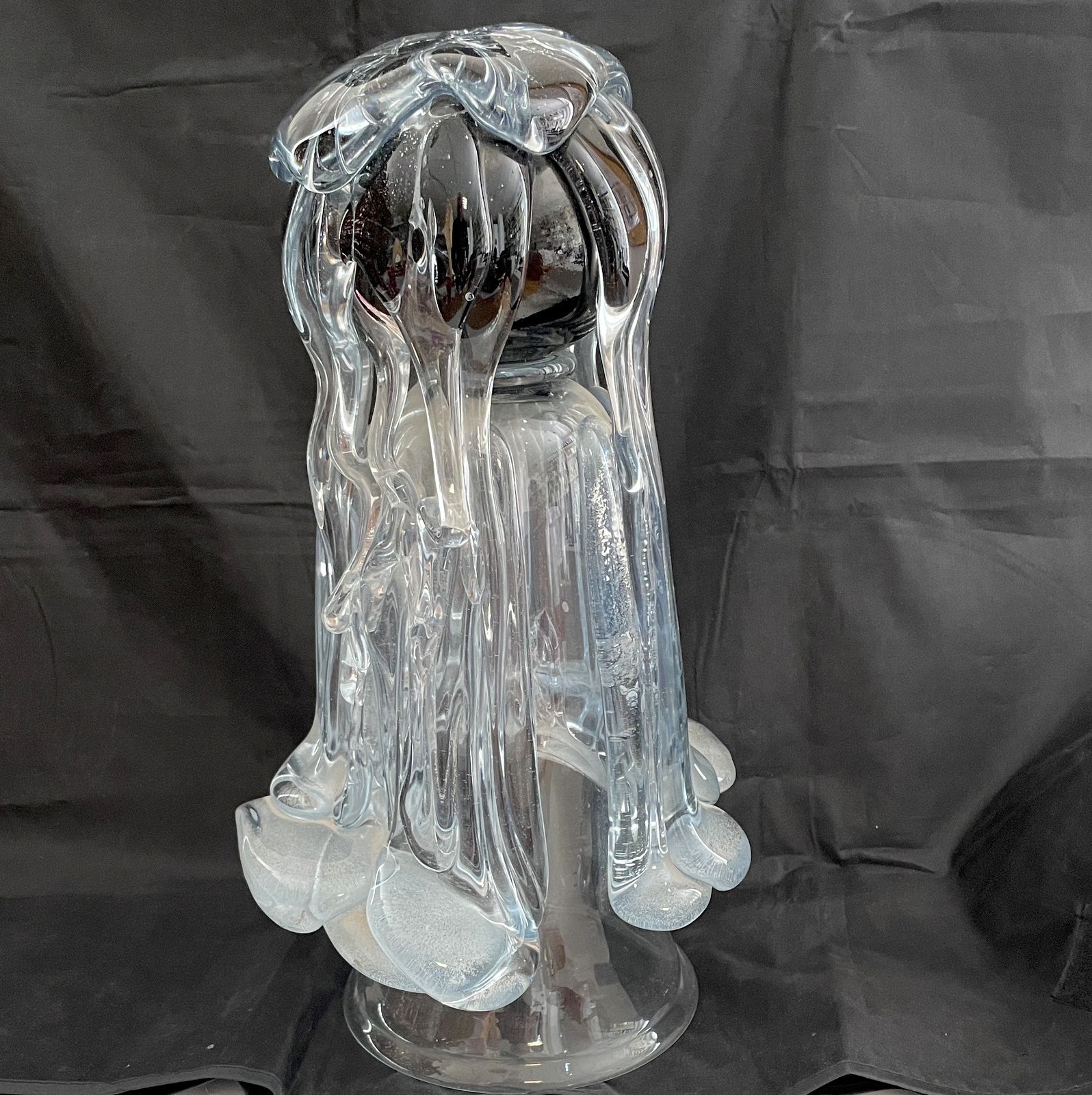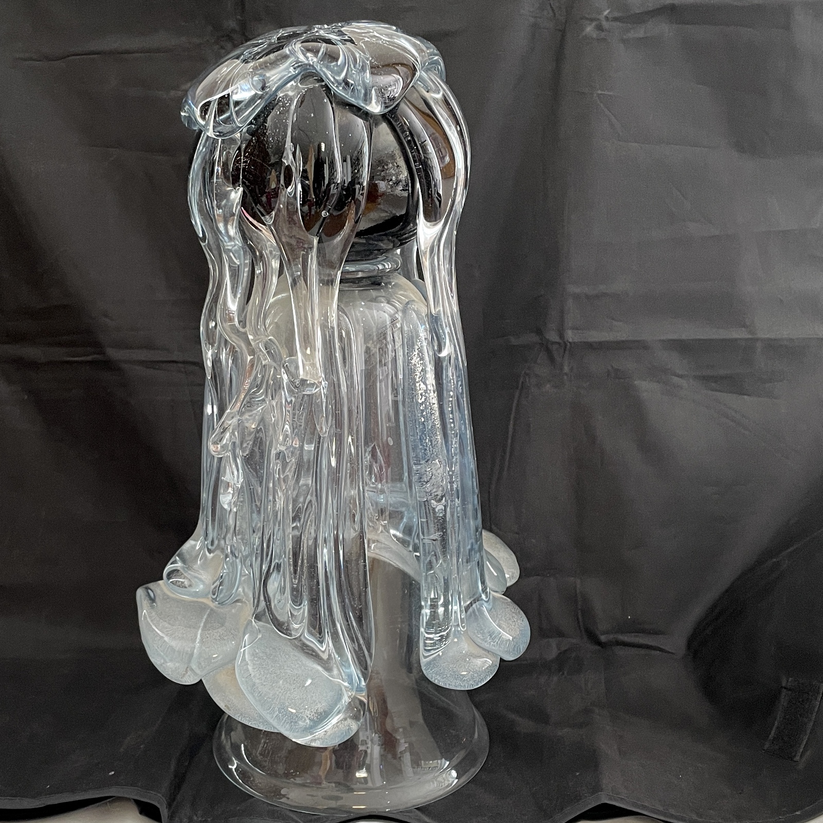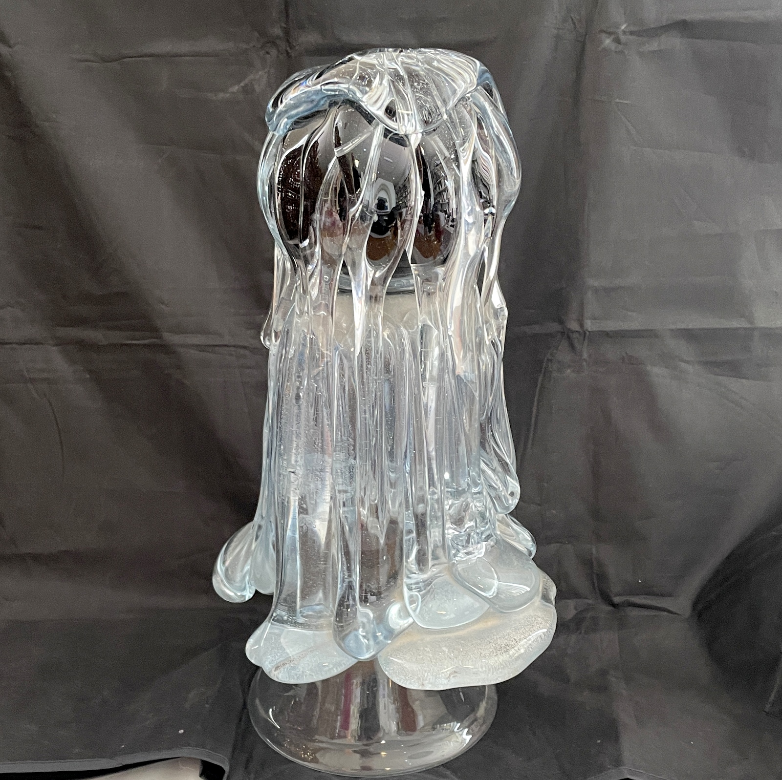 Abstrakte Skulptur Glas Kunstglas mundgeblasen Liebhaber Objekt aussergewöhnliche Statue Surreal Signature Edition Das Objekt wirkt wie fließendes, erstarrtes Glas – fast wie Wasser, Eis oder eine schmelzende Form über einem Kern. Sehr organisch und zugleich elegant ein Kunstwerk der, Höhe 32 cm Breite 20 cm Gewicht 5 Kg Signiert 1991 Oberstdorfer Glashütte<<<